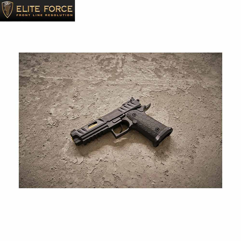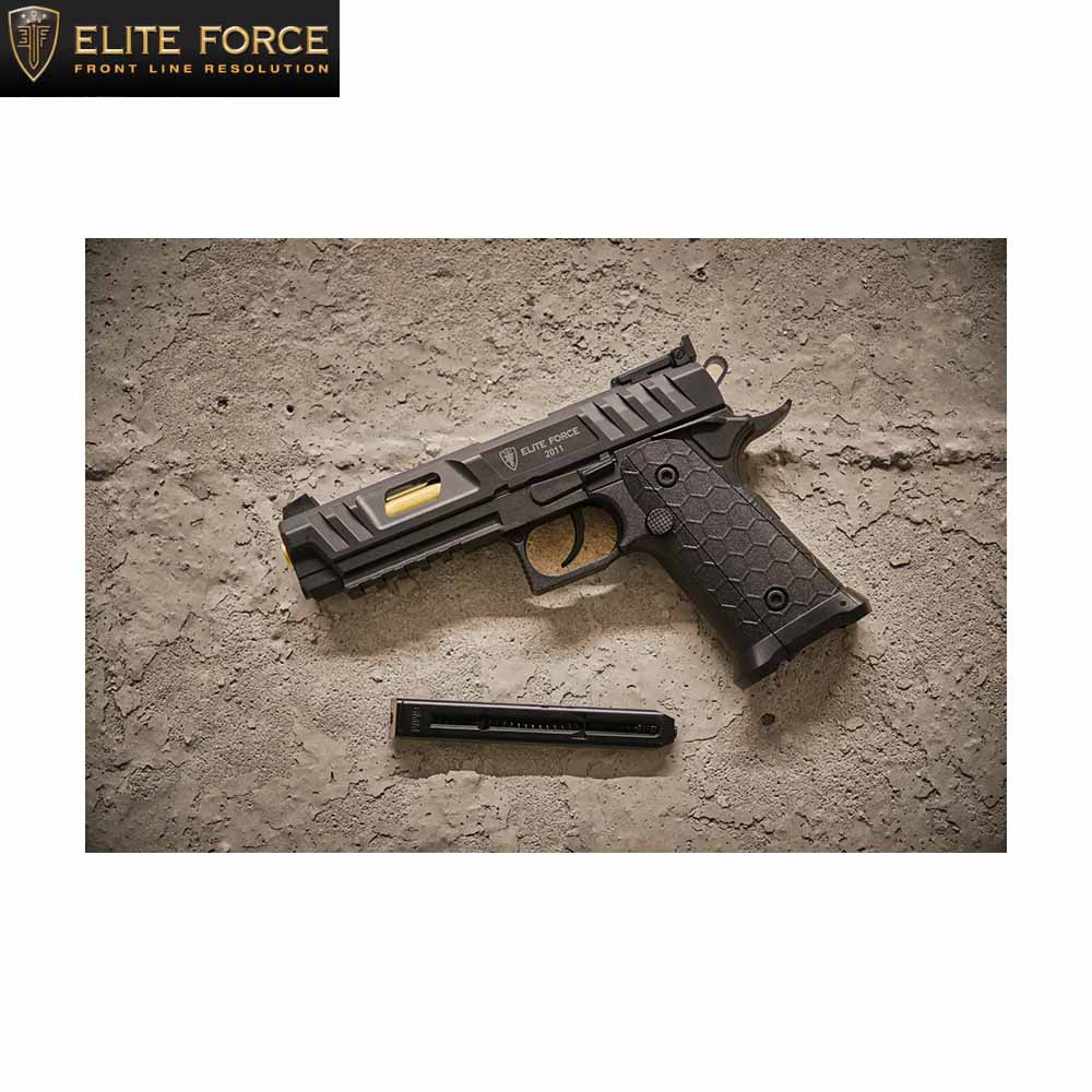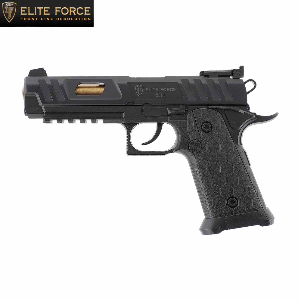 Unsere Elite Force 2011 übernimmt den starken Auftritt und punktet mit dem durchbrochenen Schlitten, der den goldenen Lauf sichtbar macht. Das hexagonale Griffdesign mit Jet Funnel und die markanten Durchladerillen am Schlitten tragen ihren Teil dazu bei. Als CO₂-betriebene NBB-Ausführung in Polymerbauweise mit festem Schlitten und DAO-Abzug bietet die 2011 hohe Effizienz und eine einfache Bedienung.